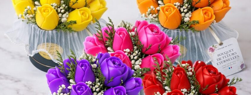 Chaque création est faite main avec amour et soin, pour offrir des cadeaux originaux et artisanaux. Les bougies aux senteurs réconfortantes comme le le monoï, la fleur de coton ou le caramel créent une ambiance cocooning.